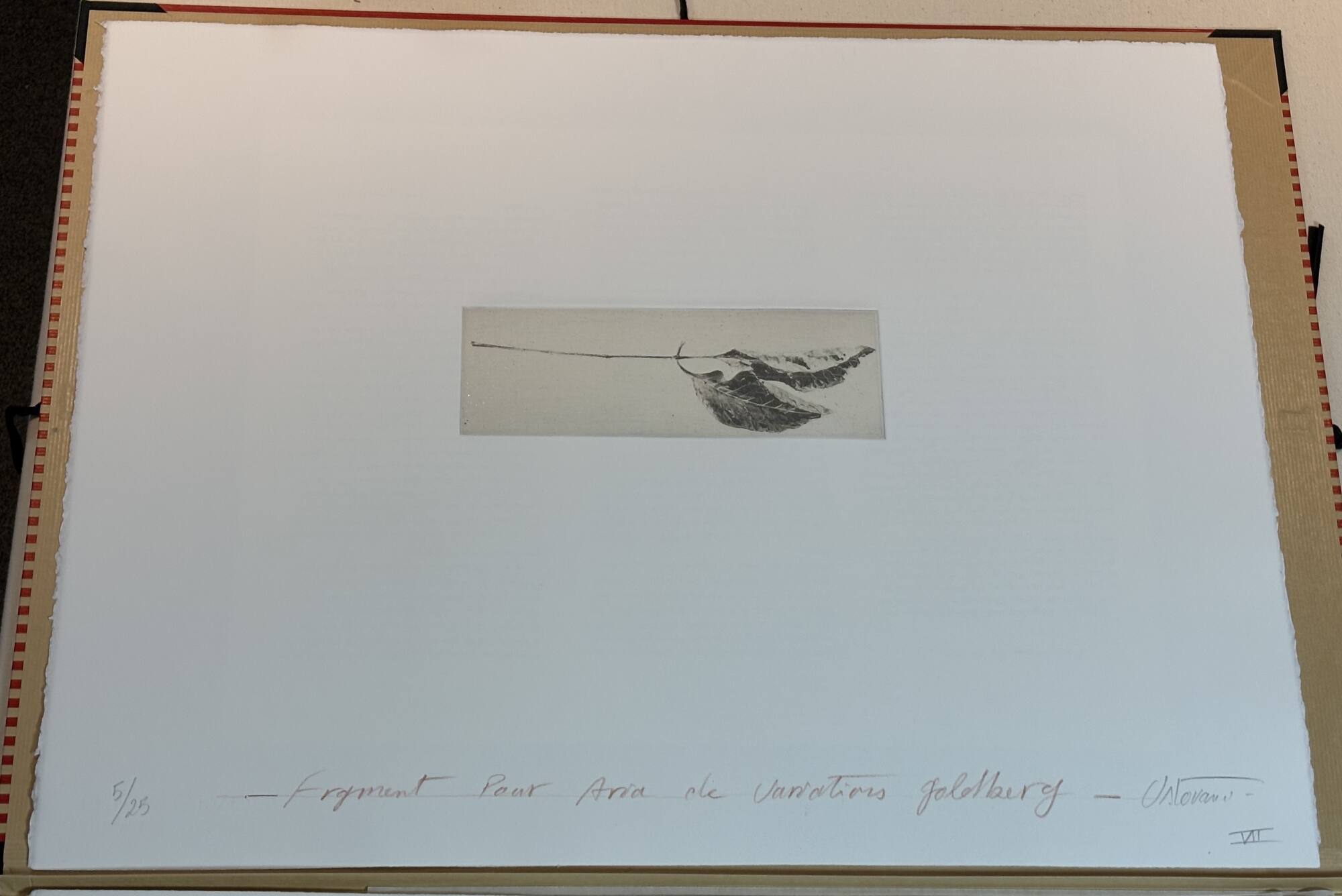 DescriptionThis lithograph print was created for the Aria of the Goldberg Variations. These prints depict leaves, the subject matter of the composition. The prints are printed on Japanese paper, each print is approximately 20 x 26 inches.
