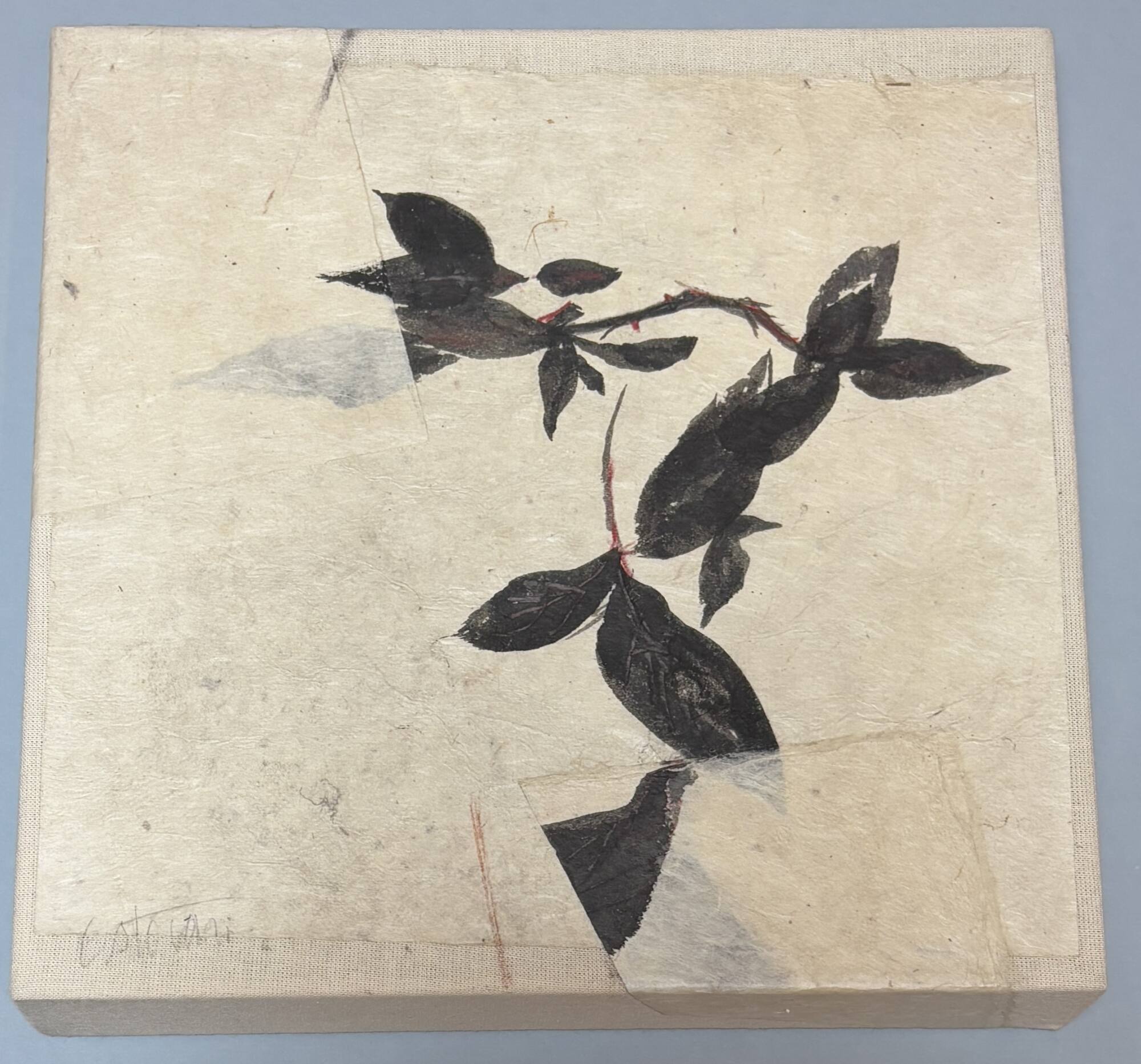 DescriptionThese three small ink and watercolor paintings on paper, mounted on small canvases are studies for the Goldberg Variations. These works depict rose stems with leaves rendered in different compositions. Wet black ink and paint is applied with a brush, which gives variation to the value and texture of the media and imbues the studies with a sense of energy. These studies reveal how Ostovani approached his subject and worked out the imagery of the Goldberg Variations.