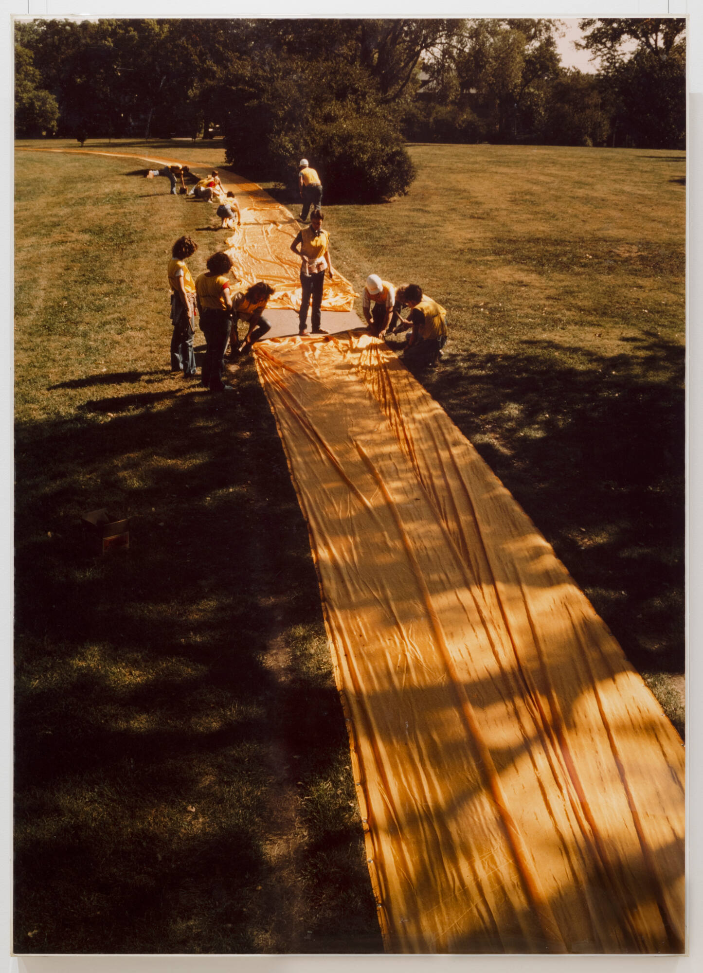 Wolfgang Volz, a longtime collaborator and the exclusive photographer of Christo and Jeanne-Claude’s work, captured the community involvement critical to Christo’s practice and the success of his projects. The installation of Wrapped Walk Ways in Loose Park began on October 2 and was completed October 4, 1978. A local contractor, A. L. Huber & Son, employed 84 people to work under Christo and Jeanne-Claude’s direction. Their work included hand stitching the seams of 15,000 rolls of fabric and securing it with 34,500 steel spikes and 60,000 staples.