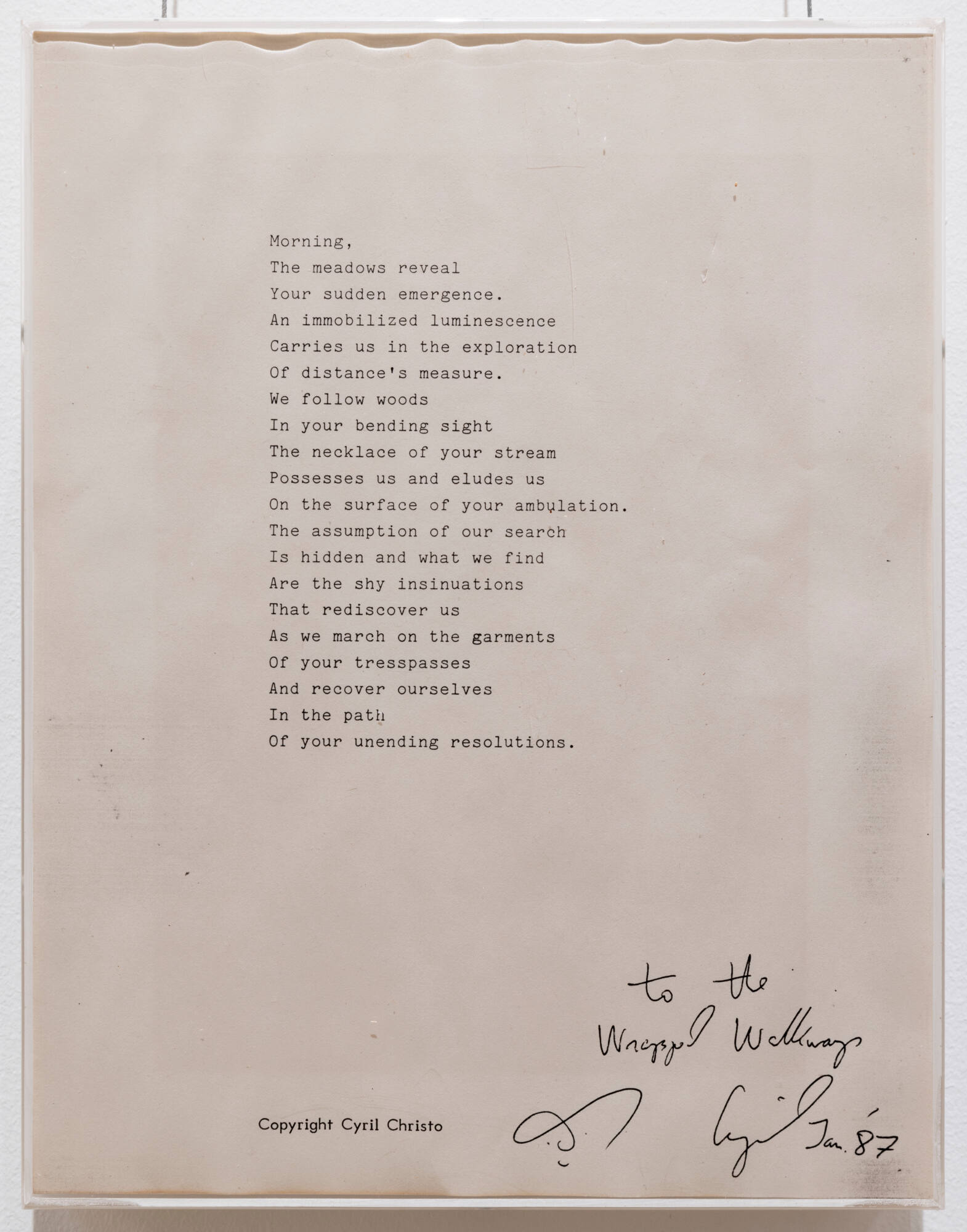DescriptionTyped document with a poem. Signed: “to the Wrapped Walkways” by Cyril, Jan. ’87.Exhibition History