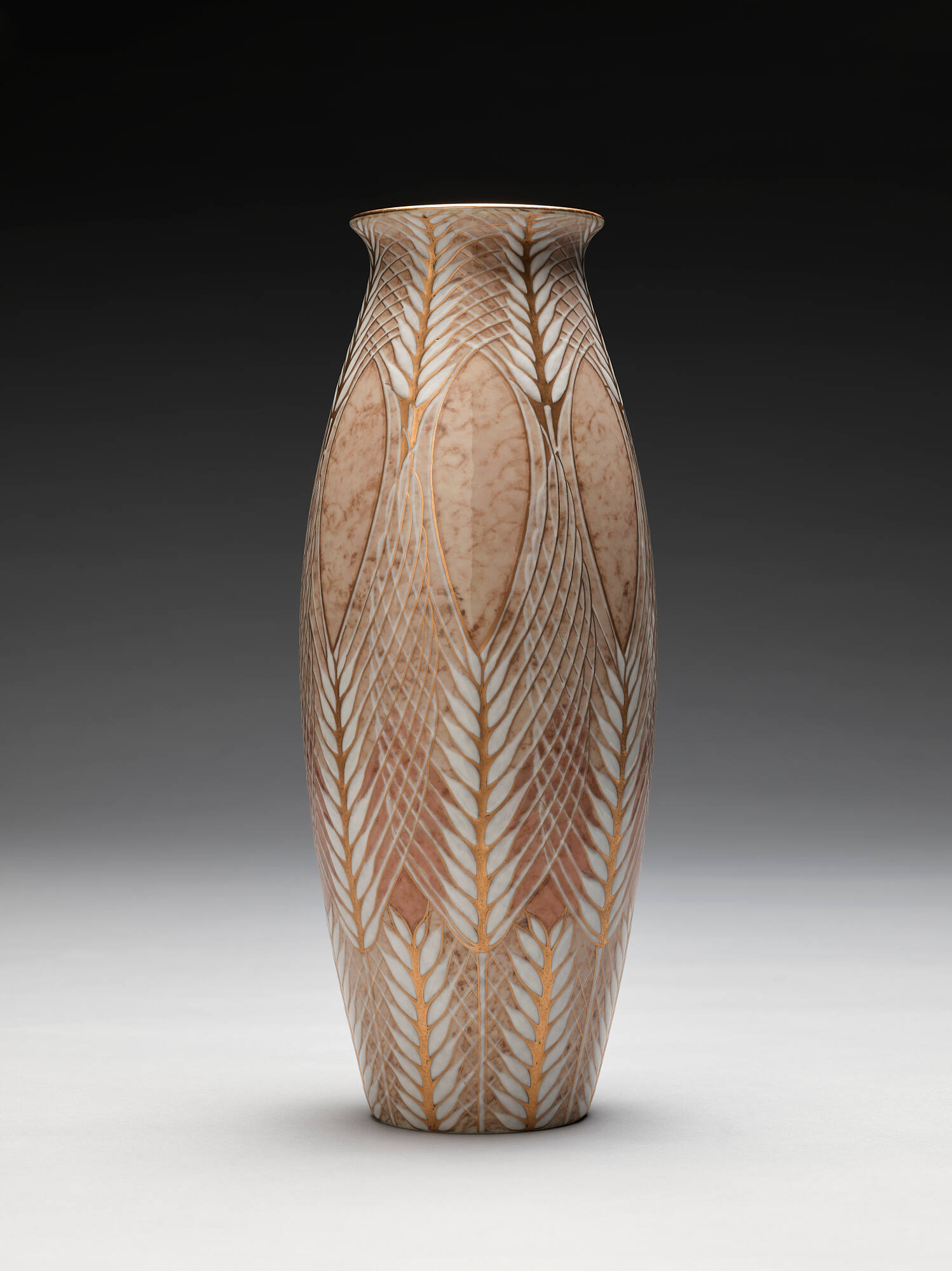 DescriptionCylindrical vase decorated with stylized wheat stalks superimposed on background of triangles.ProvenanceWith Licorne Unique, Shenzhen, China, 2021 [1];