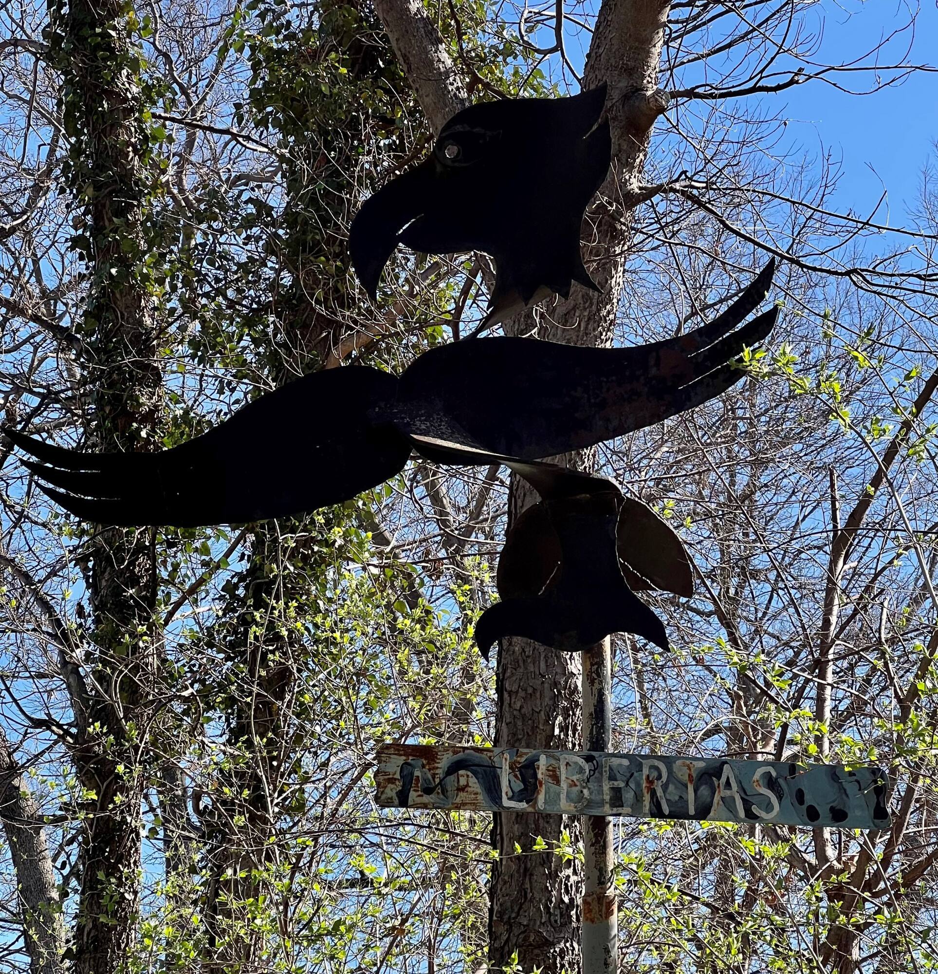 Mounted below the eagle is a rectangular sheet reading “LIBERTAS” in white, hand painted letters. The background is painted grey with swirls of thin, black paint. This work was previously displayed outdoors. ‘40923’ is written in yellow paint on the top surface of the body.