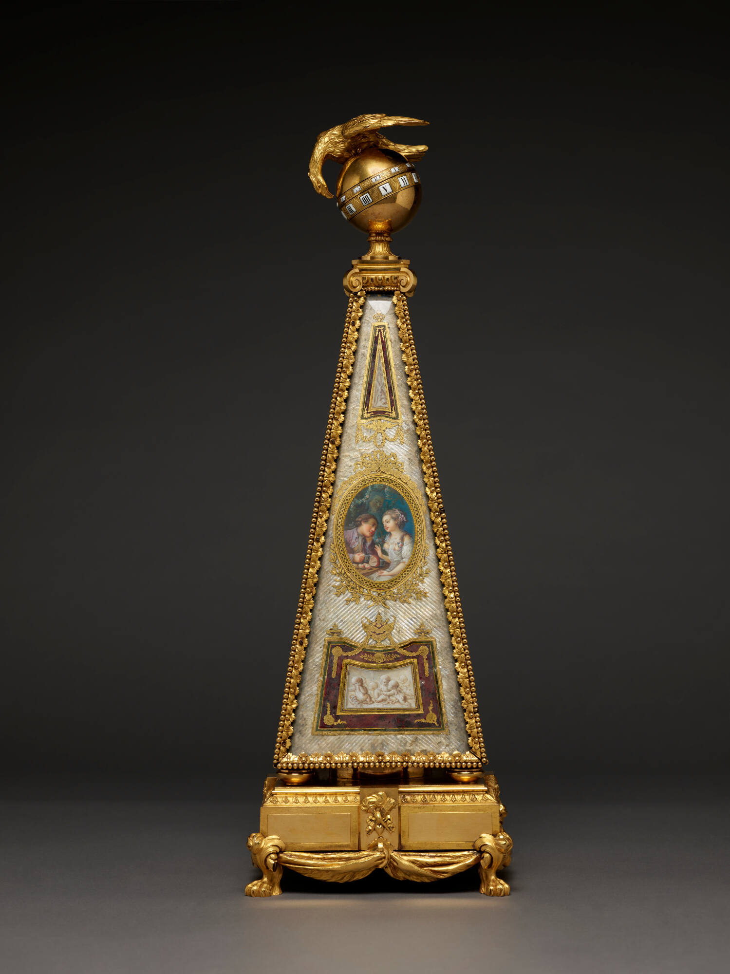 DescriptionA pyramidal clock, decorated with painted glass roundels and horizontal reliefs and ornamented with gilt bronze mounts on sides and a gilt-bronze eagle on top of movement; the whole sitting on a gilt bronze pedestal on four feet.Exhibition History