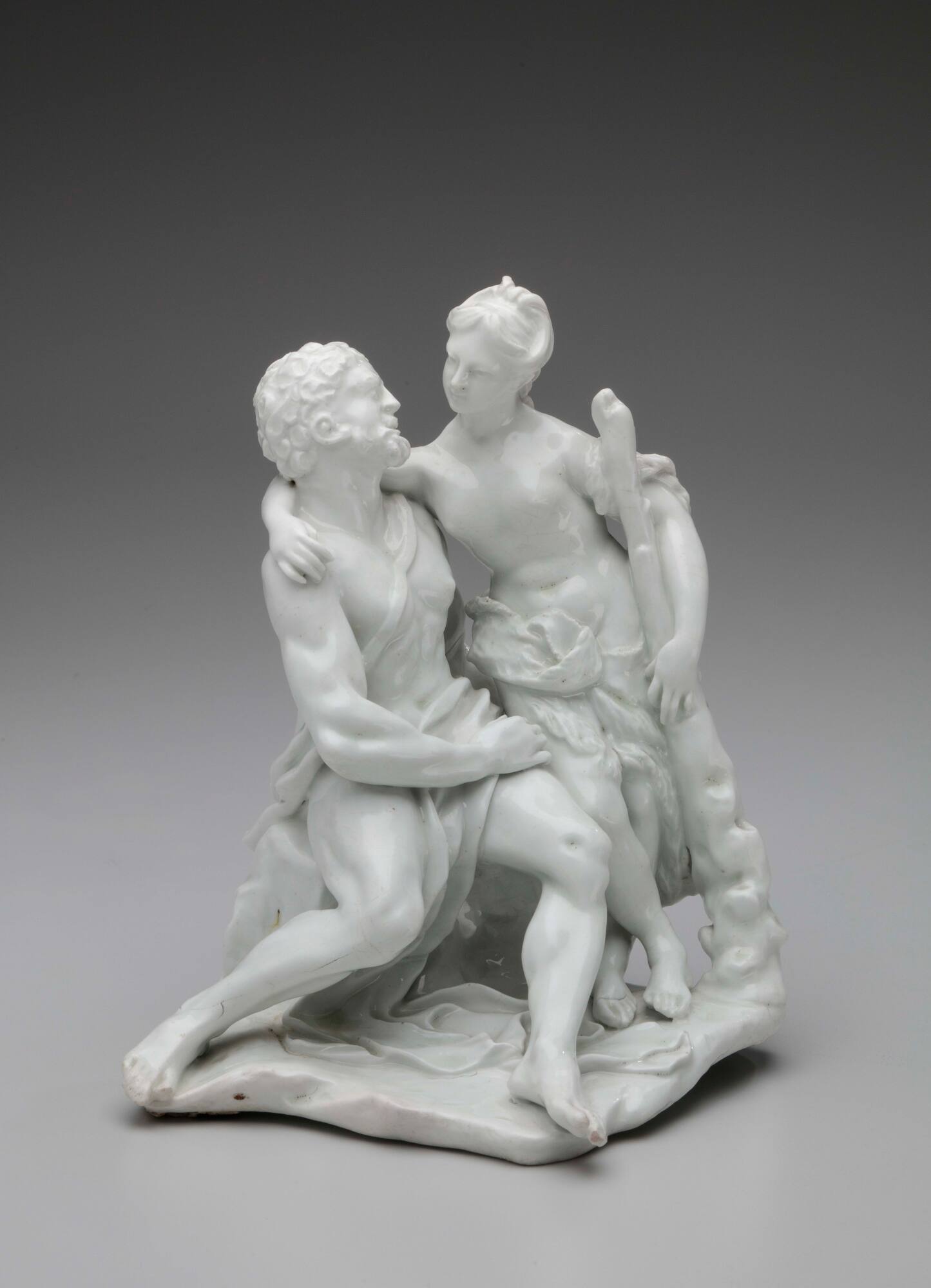 [1] Arthur Hurst was a former railway official from York who bequeathed much of his decorative arts collection to the V&A Museum and the British Museum. The remainder was sold at a series of London auctions, 1940-1941. Due to the difficulty inherent in differentiating between versions of objects created in multiples - such as this porcelain group - in historic literature, it is not certain the Hercules and Omphale piece owned by Hurst is in fact the Nelson-Atkins example. The height of the Hurst piece, however, is listed in the auction catalogue as 8 1/2 inches. The Nelson-Atkins version is the only known version of this height that could also have been in this sale. Versions at the Museum of Fine Arts, Boston (9 inches), the Metropolitan Museum of Art (8 7/8 inches) and the Fitzwilliam Museum (9.3 inches) are recorded as slightly taller, although these size differences could be negligible.