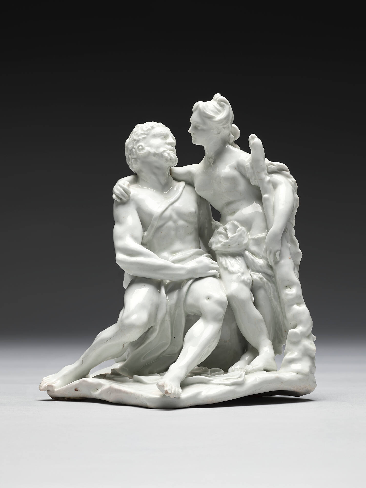 DescriptionA white-glazed soft-paste porcelain figural group of two intertwined lovers, Hercules seated with Omphale standing over him. She wears his lion's skin mantle and holds his club.Exhibition History