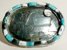 MediumCatlinite, turquoise, shell, jet, mother of pearl, and trade silver