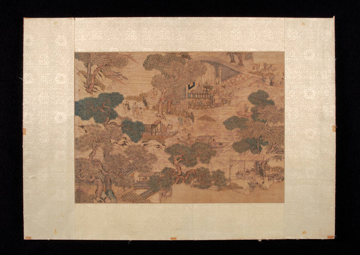 DescriptionLandscape of trees, boats, pagodas, teahouses and figures in brown, blues, and green. Mounted on paper with a green brocade border.ProvenancePurchased on the Chinese art market, through Laurence Sickman, by The Nelson-Atkins Museum of Art, Kansas City, MO, 1933.
