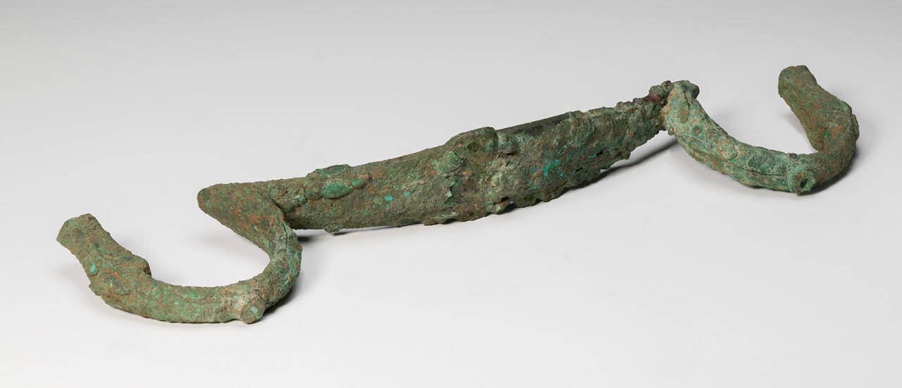 DescriptionCurved bronze with horse's head on each end. Character inlaid with turquoise. Green patina.