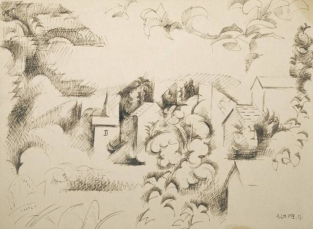 Gallery LabelAndré Lhote’s pen and ink landscape features a cluster of buildings, billowing foliage, and distant hills, all rendered in a delicate style, leaving large sections of the paper blank.