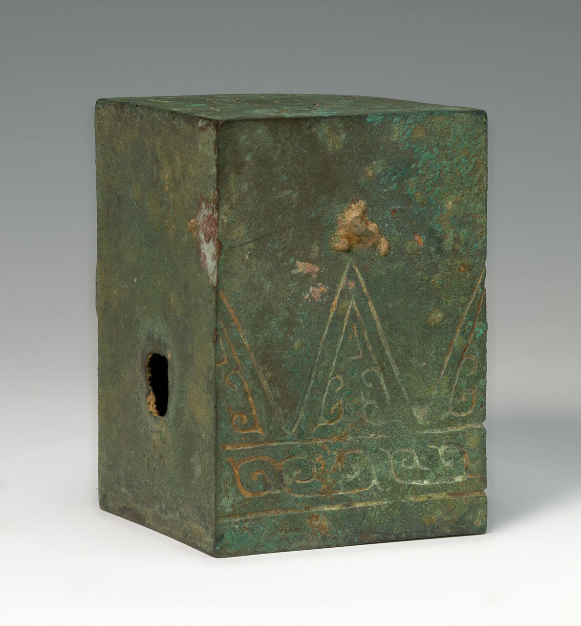 DescriptionRectangular shape, hollow, one end open, a hole in both sides. Incised abstract designs on surface.ProvenanceT'ang Hsiao Wu, Peiping (modern-day Beijing), China, by March 30, 1934;