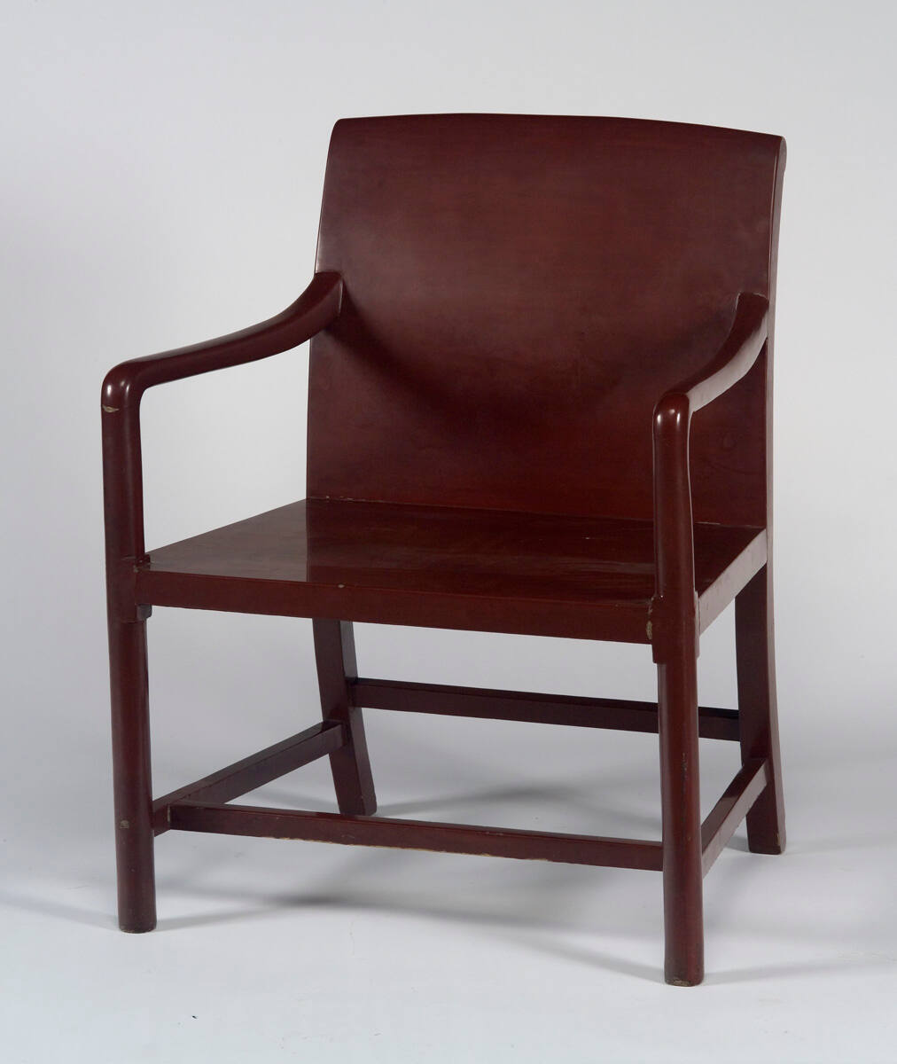 DescriptionWood armchair of a very plain design, with a wide seat, and lacquered a deep red.