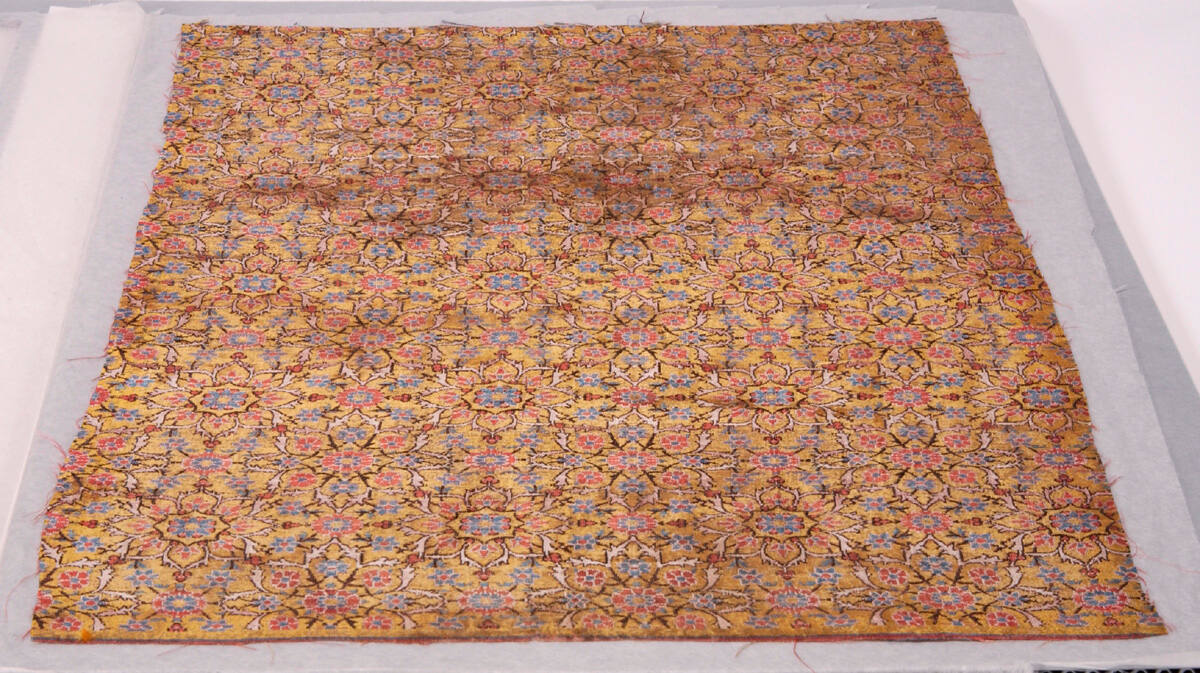 DescriptionGold background, small medallions, conventionalized flowers in blue and orange.Exhibition HistoryNo exhibition history known at this time.