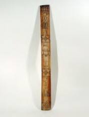 Not on viewOn this panel, the two central bands have a single central diamond shape with four smaller diamonds carved within. They are flanked by two half-diamond shapes on either side. The top and middle figures appear to be male, wearing intricately patterned garments and accoutrements, including arm and ankle bands. The lower figure, shown with a knee-length skirt and a traditional hairstyle or headdress, appears to be female. In addition to the arm and ankle accoutrements, the figure is seen holding an object in their hand - possibly a small knife.Provenance