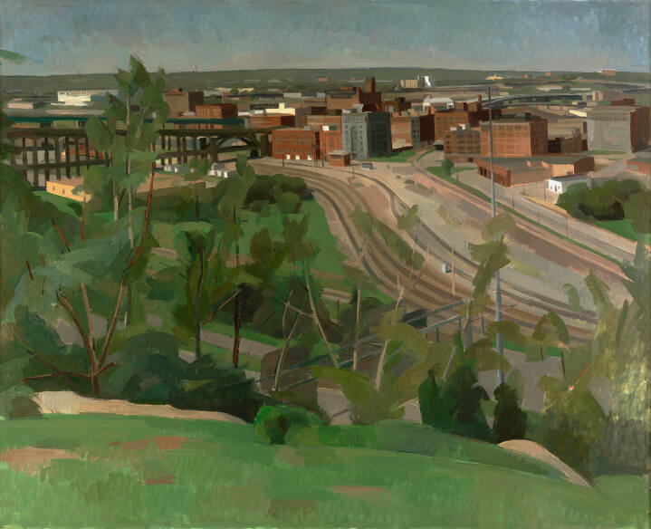 DescriptionA view from a grassy hill, overlooking railroad tracks beyond which lie clusters of multi-storied buildings resembling warehouses. Just beyond the immediate foreground, a group of trees rises through the composition to the high horizon line. To the right of these trees a structure resembling a footbridge is suspended over the road below.Gallery LabelWilbur Niewald's paintings of many Kansas City neighborhoods, like this one of the distant West Bottoms, have been characterizes as "full of plain truths about things." His striking perspective enlivens what might otherwise b a rather ordinary urban scene.