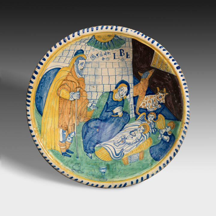 DescriptionDecorated in polychrome with nativity scene: in background wall, left, hound and recument ox, right; center, standing figure of Adam, seated figure of Mary, Child in crib, angel at head of crib, kneeling figure, right; jug and goblet in foreground. Beneath stylized sun, top, inscribed : 1652 LBE. Yellow and blue-dash borders. Inscribed in blue on rear: 1652 LBE; TH within foot rim.Gallery LabelProbably derived from a print, the vivid polychrome decoration was inspired by Italian maiolica, or tin-glazed earthenware. The meaning of the letters "LBE" is unknown.