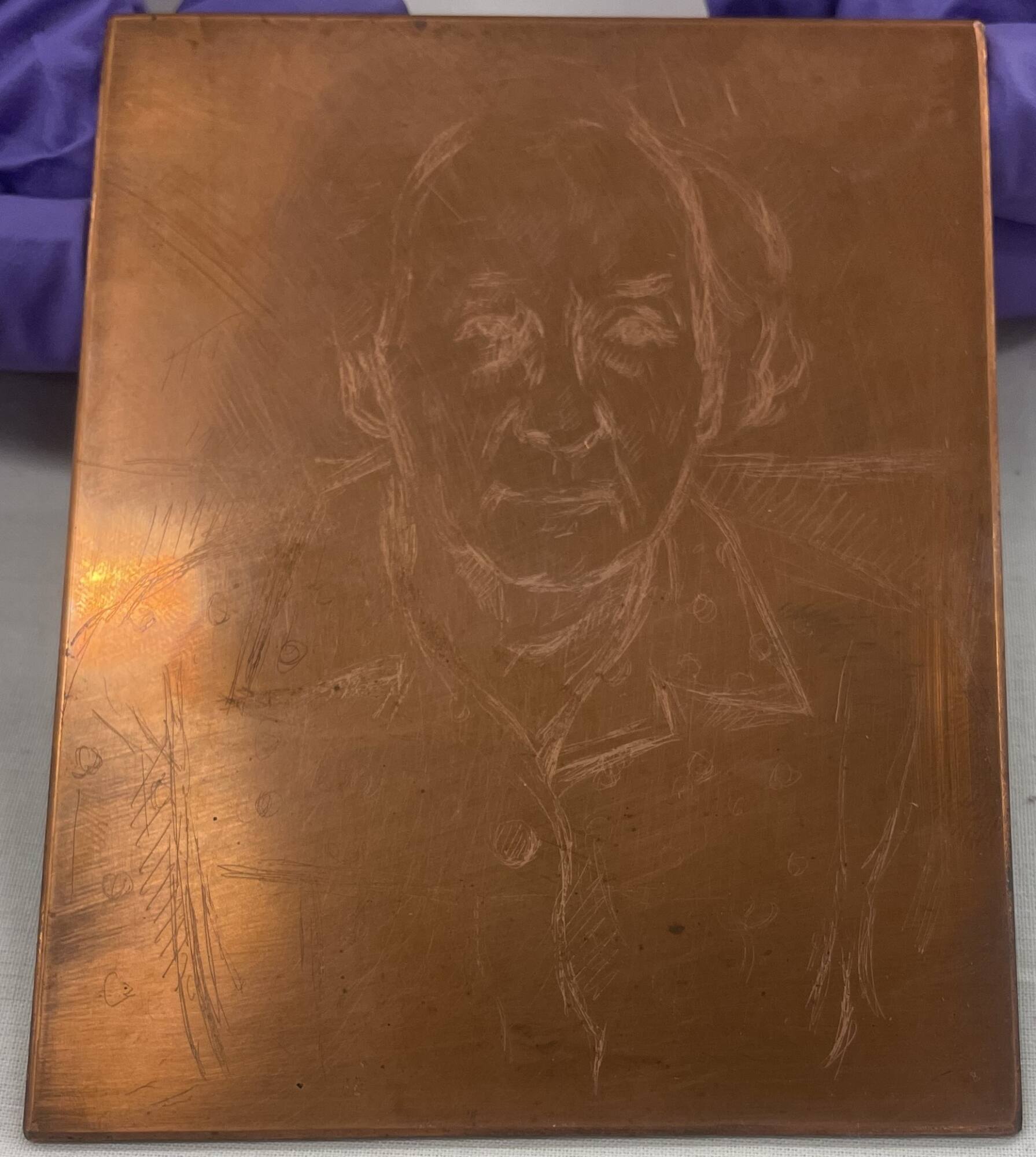 DescriptionThis is one of 13 copper plates used for printmaking. These plates have etchings on their surfaces which depict various things: trees and landscapes, city skyline views, still lives with flowers, and self-portraits.Provenance
