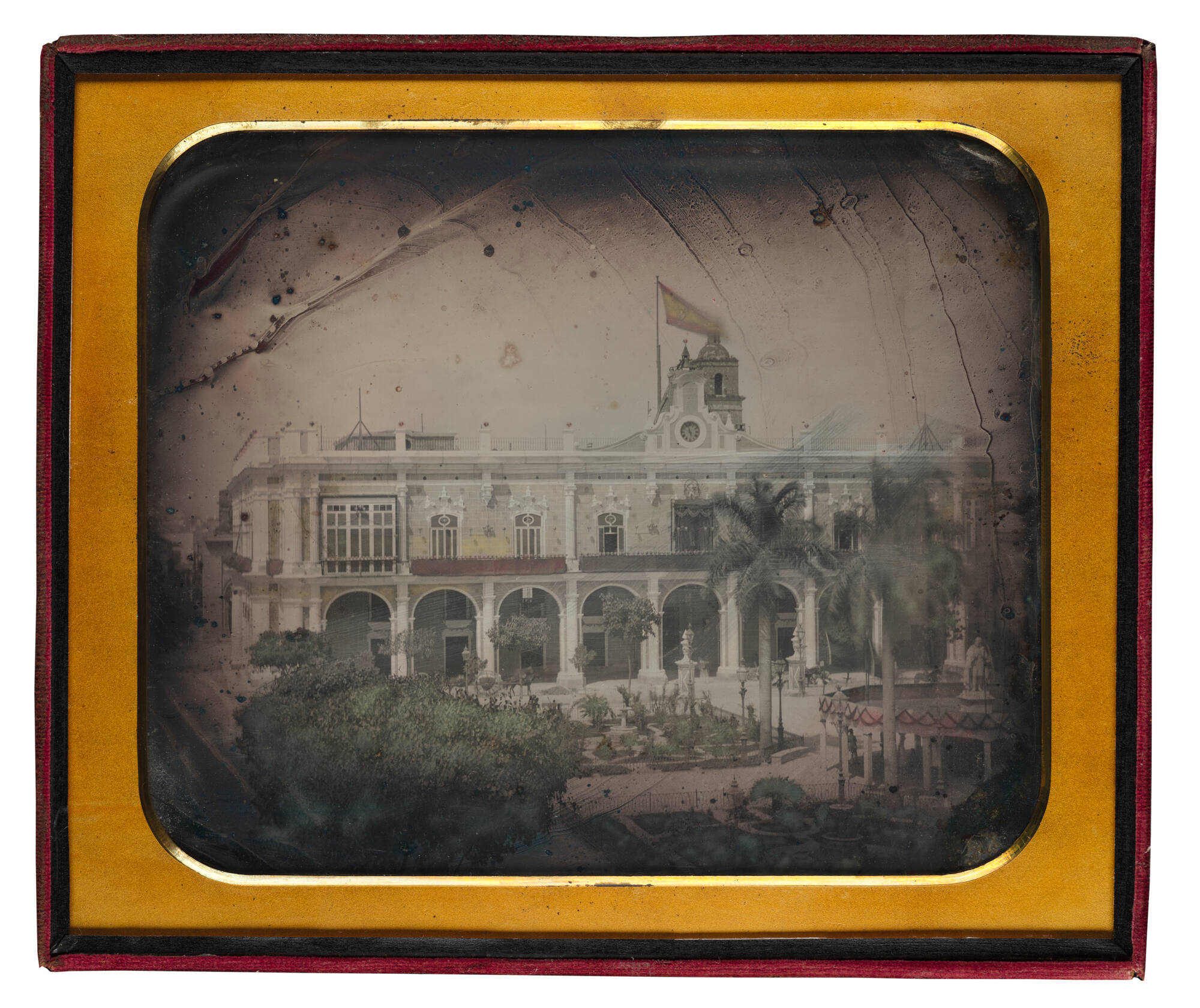 DescriptionImage of a large two-story building with a clock and flag at the center. The facade features columns with arched openings and decorative window moldings. The main entrance's garden is decorated with plants, sculptures, post lights, and palm trees. This hand-colored two-thirds plate daguerreotype is housed in a brown leather case with a floral design, brass mat, and red silk liner.