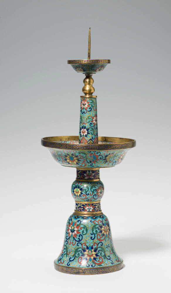 This set of gilt and enamel cloisonné vessels is comprised of an incense burner in the center flanked by pairs of candlesticks and flower vases. These types of vessels were used—in various religions—to hold offerings on altars. They would have been lined up on the altar table in a temple, an imperial mausoleum or for ancestor worship as displaying here.