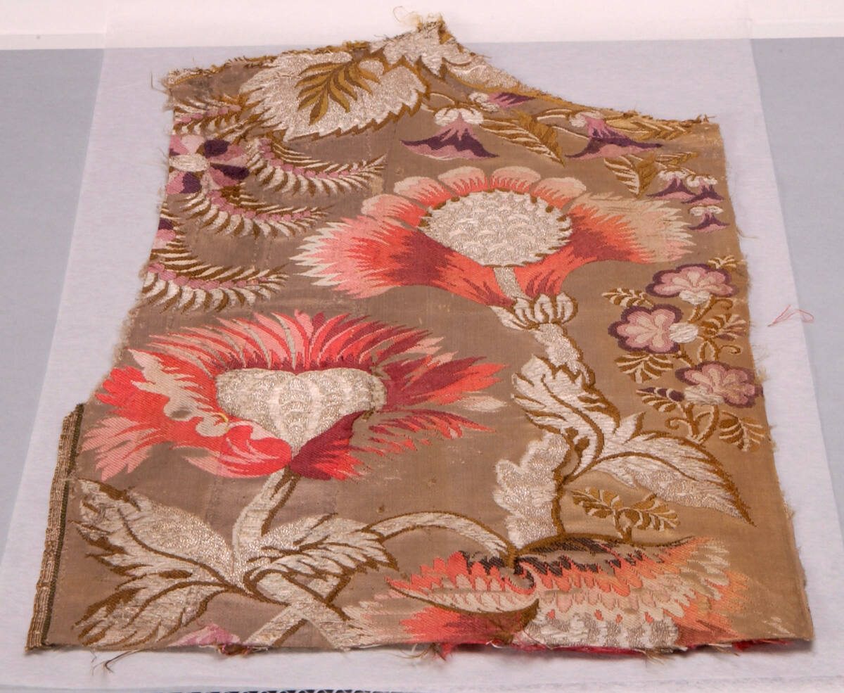 DescriptionDesign of large conventionalized flowers in shades of red, orange, brown, and silver on grey background.