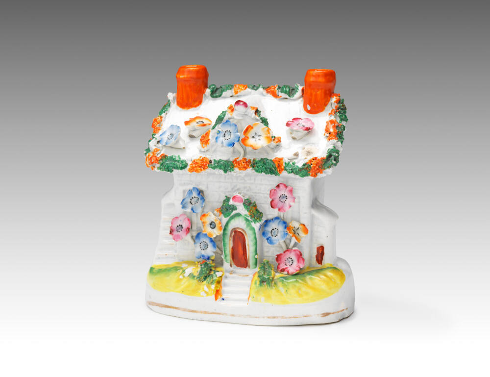 DescriptionOne-piece white earthenware cottage. Orange chimney-pots at each end of roof, which has multicolor vines and overscaled flowers. Facade of house has same type of flowers coming out of yellow and green terrace (base). Red front door set into green arch casing.Exhibition HistoryCastles, Cottages, and Crime, The Nelson-Atkins Museum of Art, Kansas City, Missouri, July 10 2021–March 06 2022, no cat.