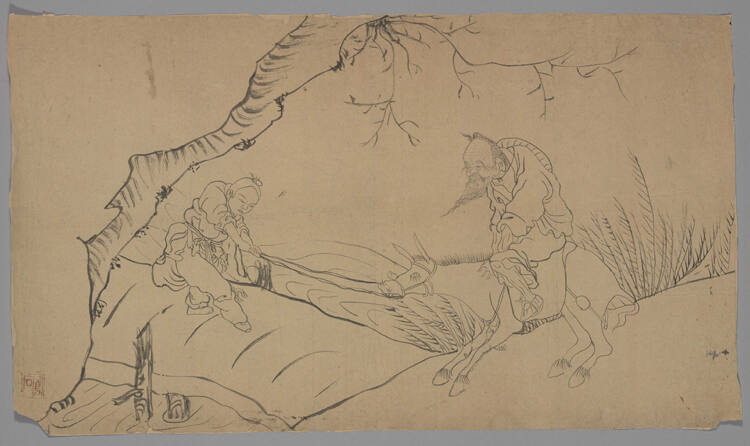 DescriptionAt right, figure of old bearded figure riding on donkey on shore, with young figure to left on bridge pulling on reins of animal, facing animal. with tree to left.