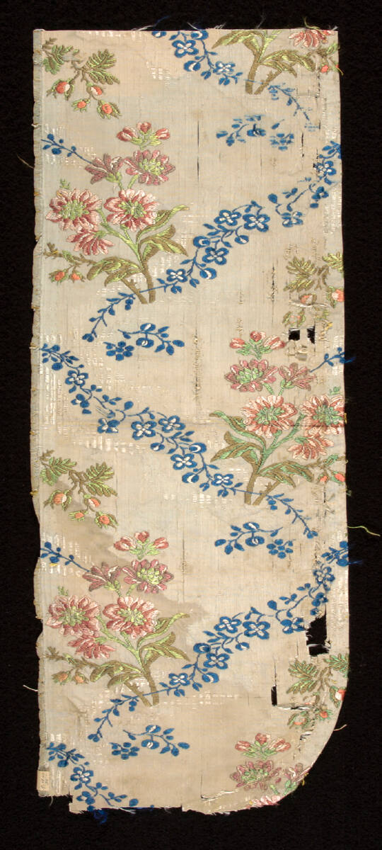 DescriptionCream silk with flush patterning, borcaded with polychrome silks.