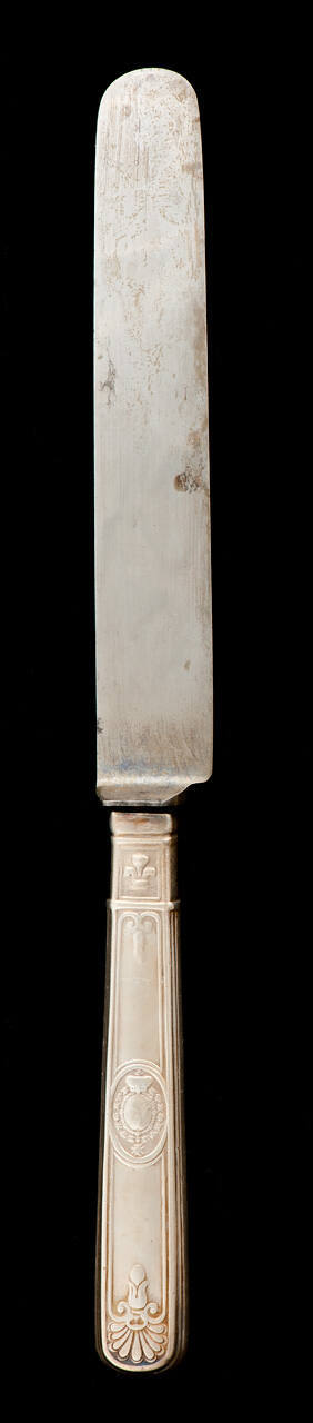 DescriptionStraight-handled knives, engraved with fleur-de-lis and other patterns. Coat-of-arms consisting of fleurs-de-lis, wreath, crown above and croix below.