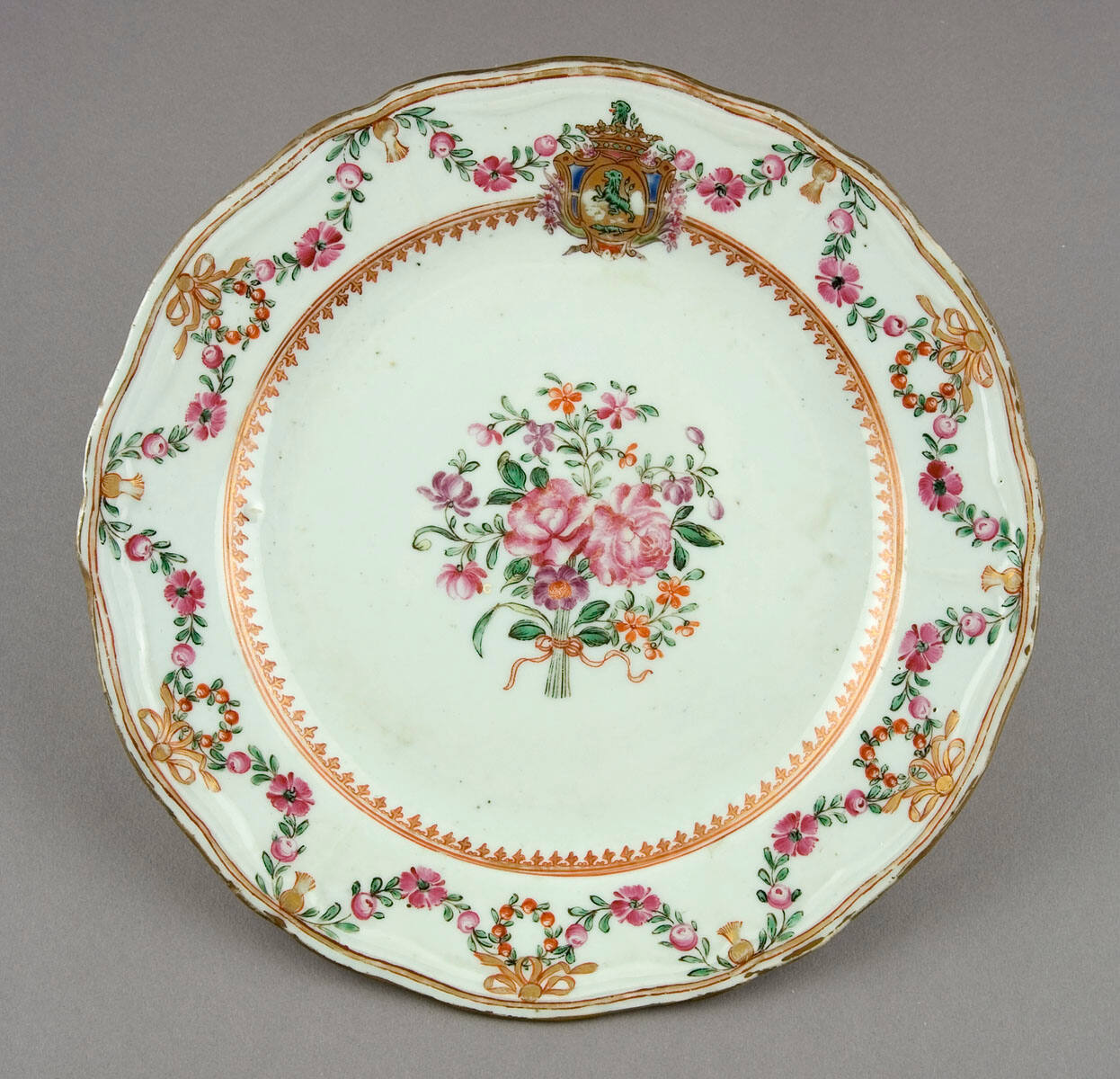 DescriptionScalloped-edged plate in so-called "Famille Rose" manner; coat-of-arms of rampant lion in green with escutcheon gilt on the border. Rose bouquet with smaller purple, orange and pink flowers, tied with gilt bow, in center. Border decoration of elaborate rose garlands and wreathes of orange berries.