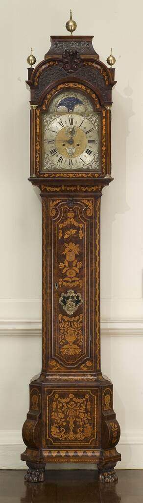 DescriptionThe case is veneered with pieces of various types of woods. The background is a medium-dark wood decorated with lighter-toned motifs of foliage, birds, vines, tulips, vases, butterflies and cupids. Brass ornaments include the claw feet, applied mount on case door, column base and capital flanking the clock face and three finials on the top of the case. The dial is brass with silvered hour hand and engraved numerals. The circular disc within the clock face revolves to show the days of the week, with names being in Dutch. Each division of the disc shows the pagan divinity that gives the name to the day: Apollo/Sunday, Diana/Monday, Mars/Tuesday, Mercury/Wednesday, Jupiter/Thursday, Venus/Friday, and Saturn/Saturday. Above the clock face, a circular disc displays the phases of the moon.