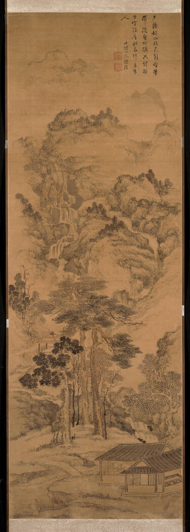 Zhang Fu expresses his love for autumnal beauty in this towering mountainscape. In the lower left corner, a gentleman (perhaps Zhang himself ) and a servant boy trek toward a hermit’s home. The home is located in a deep mountain valley, echoed by a waterfall and foliage whispering in the wind. While picturing the coolness of nature, Zhang also hints at the warmth of the human world: just ahead lies the hermit’s cottage, filled with books and antiques.