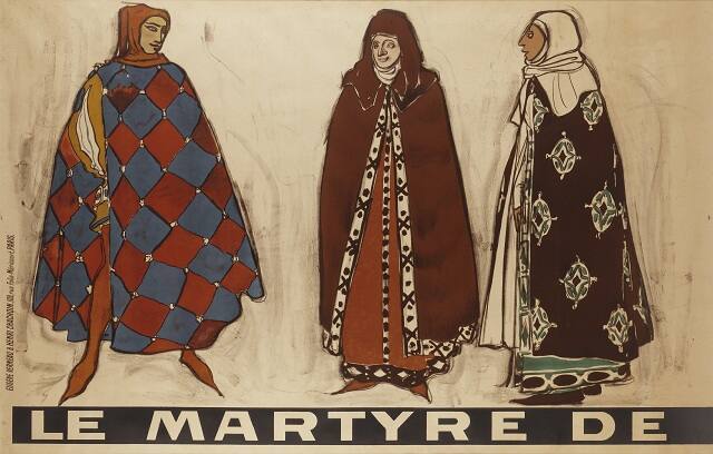 DescriptionThree full-length figures in rich medieval-cloaked costumes. Sebastian, first figure on left. The words "Le Martyre de" in white block letters on black band at bottom of image.Gallery LabelThe six figures in this two-part poster represent members of the supporting cast in Gabriele d'Annunzio's sacred drama, The Martyrdom of St. Sebastian. With choreography by Michel Fokine, music by Claude Debussy and costumes by Bakst, the play opened at the Théâtre Châtelet in Paris in 1911. Bakst's richly colored and boldly patterned costumes were inspired by the Byzantine mosaics and sculpture he studied at the Louvre Museum and saw in Italy and Turkey. He designed a total of 500 costumes for this grand theatrical spectacle.
