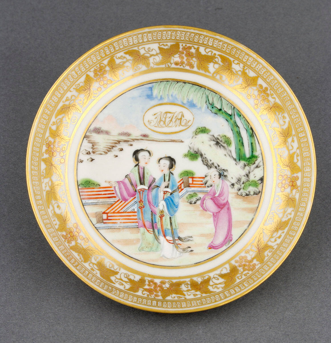 DescriptionPart of 77 piece tea service. In bottom of saucer, on exterior sides of cups is a scene painted in famille-rose style stowing 2 Chinese ladies and attendant in garden. Above figures is gold monogram, MTA (?) in gold oval. On interior sides of all pieces is border design in gold of grape bunches and leaves. On handleless cup on exterior side is also a gold spray of leaves and berries.