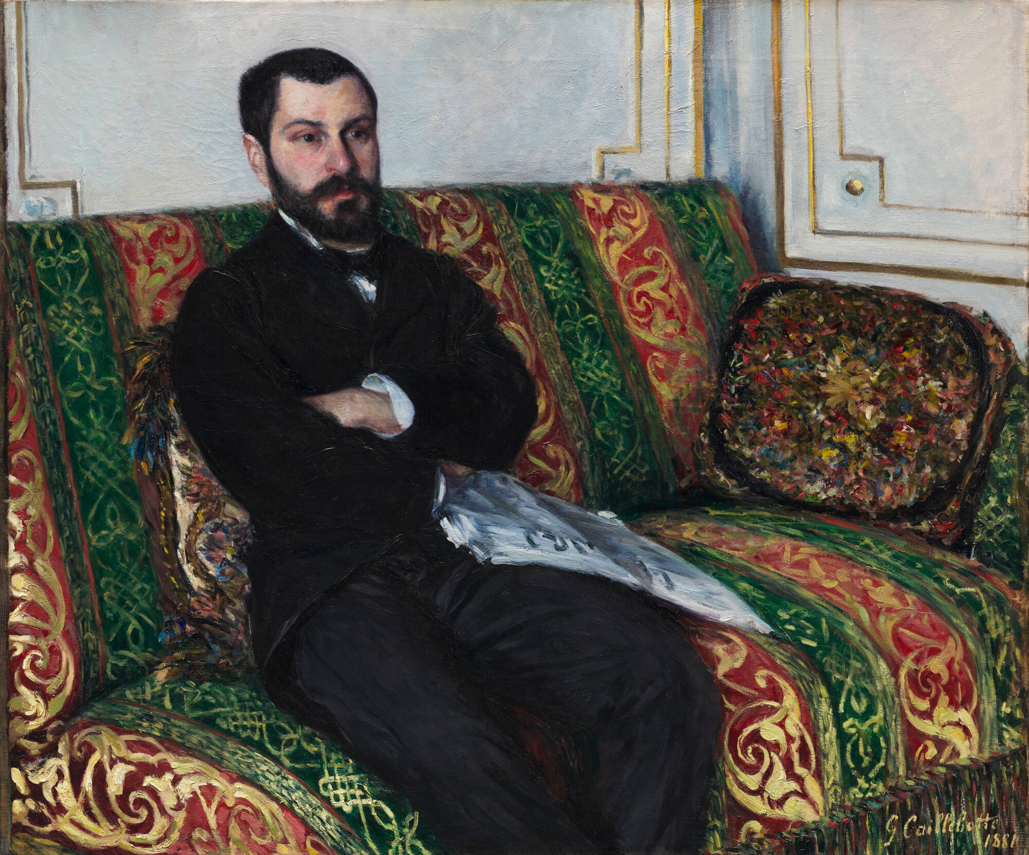 Richard Gallo, a close friend of Gustave Caillebotte and editor of the liberal newspaper Le Constitutionnel, is shown with his arms folded defiantly across his chest and a copy of the conservative rival paper, Le Figaro, on his lap. Caillebotte developed a distinctive style characterized by spatial distortions that often suggest the mood or psychology of his subjects.