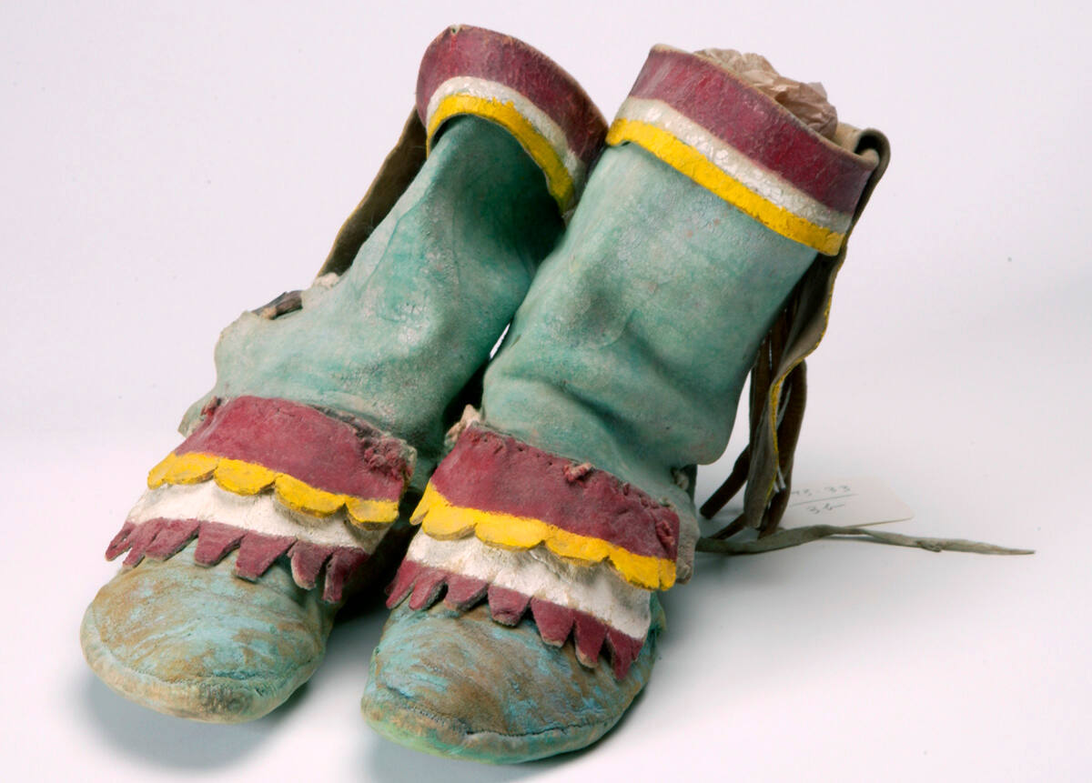 DescriptionPair of gessoed and painted leather boots, overall turquoise color. Boot cuffs are painted and decorated with red, white and yellow pigment. Painted boot anklets of leather with red, yellow, and white and scalloped edges. Tarnished silver button outside and inside of boot.