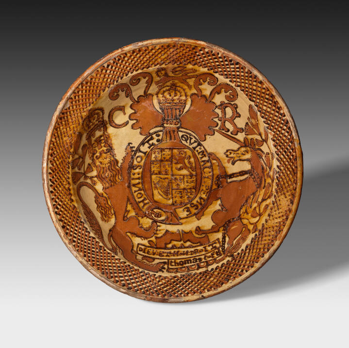 The use of political motifs on 17th- and 18th-century ceramics is much like today's use of political imagery: to display loyalty to a political party or cause. Many of the images of English royalty on the objects in this case were inspired by popular paintings and prints that were translated onto ceramic objects. The large dishes in this case, called chargers, were primarily decorative pieces though they may have been used for serving on special occasions.