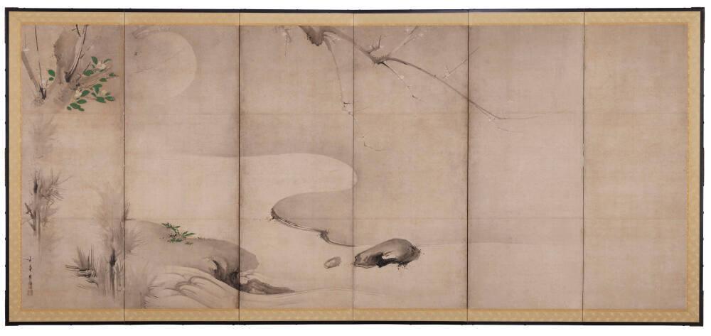 In this painting, Kaihō Yūshō captures a tranquil moment before dawn when the hazy moon illuminates a valley. The artist used wet, broad brushstrokes—known as boneless-style and originally from China—to capture the misty atmosphere. In the space where the light and shadow intersect, the rocks and trees disappear into the mist.