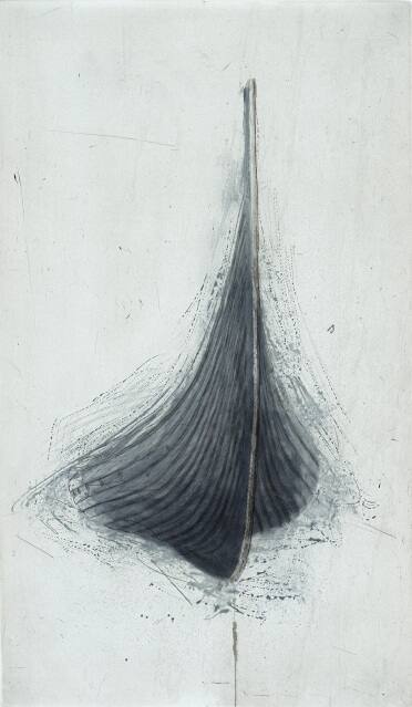 DescriptionLooming view of grey-blue ship prow, seen slightly from right, surrounded by spit-bite spots, lines, and areas; one line extends below prow to bottom center. Light grey background has random scratches.Gallery LabelRobert Stackhouse is a noted American sculptor whose drawings, watercolors and prints depict iconic images of ocean liners, boats and serpents. His sculptures, made of wood slats, resemble A-frame architectural structures or ancient vessels. A fluid dialogue between sculpture and drawing is reflected in Stackhouse's art. In this etching, the undulating contours of what appears to be a wooden, sea-going vessel are surrounded by a wash and splatter of blue-gray paint. The prow of this ancient vessel seems to puncture the surface of the paper. The ship appears to float on the paper and break through its surface, as if appearing from the past to enter our present moment.