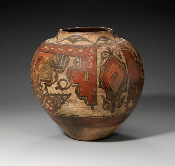 Gallery LabelMany scholars regard this beautiful jar as the finest of all existing Santa Ana ceramic works. The overall composition, a powerfully conceived construct of bold singular shapes, complex configurations and delicately painted details reflects the work of a true master. The painted design shares elements found on many Pueblo jars of the early 1800s. Most dominant are the stepped figures, which join with interlocking hatched and solid motifs containing smaller unpainted elements. Large diamonds, repeated arcs, triangles, a number of rectangular eyes and spiral forms that may represent feathers complete the pattern. This imagery, while highly abstract, is known to be emblematic of ritual symbolism and religious belief. The jar’s deep color is enhanced by the lustrous patina of great age and long use.