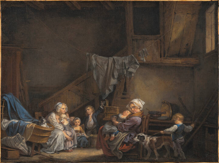 In this painting, Jean-Baptiste Greuze presents two nursemaids with the six small children under their care. Greuze treated the scene with humor, creating amusing details like the cat in the cradle. However, he may have intended the painting as a social critique.