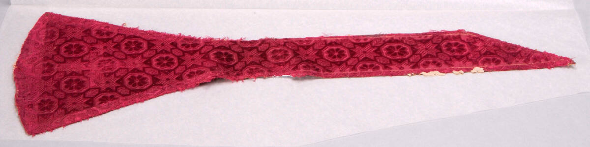 DescriptionAll over geometric pattern cut in crimson velvet.