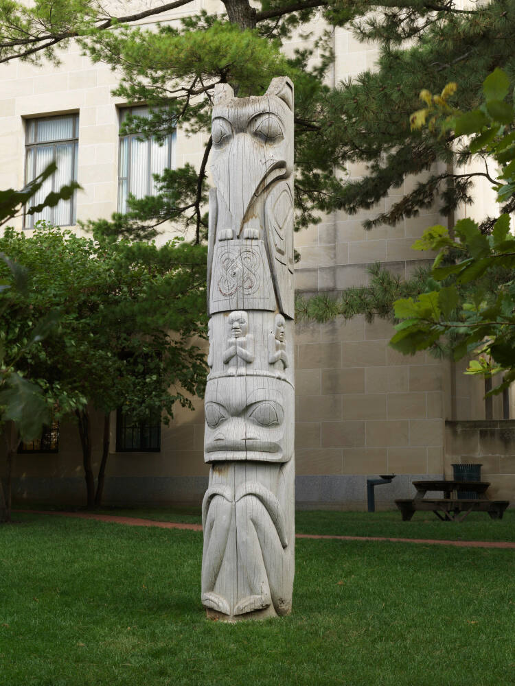 Created by Kenny Mowatt and Charles Heit, this pole is understood in four sections. On top, a raven clutches two interlocking ovals: the symbol of Kansas City. Below, three figures side by side represent the patron, the mayor of the city, and the director of the museum. It is anchored by a frog, referencing artist Mowatt's clan. Both artists are from specific clans in the Gitskan tribe. Traditionally, Norhtwest coast indigenous tribes, such as the Gitskan tribe, raise totem poles as reminders of their rights and accomplishments.