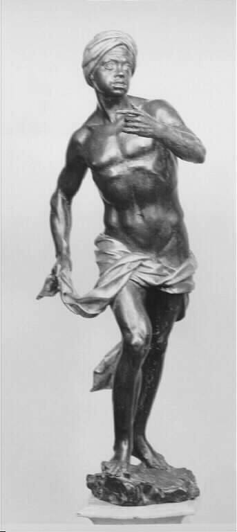 DescriptionStanding nude figure wearing a gilded turban and loin drapery. The figure is depicted striding forward, opposing limbs in similar positions: one leg advanced, one hand retracted and grasping cloth at hip, other arm aloft, as if holding rein, head looking toward non-existent horse. Original yellow-orange Giallo di Siena marble bases, bombe in plan, scotia curve in elevation; bronze has dark brown patine.