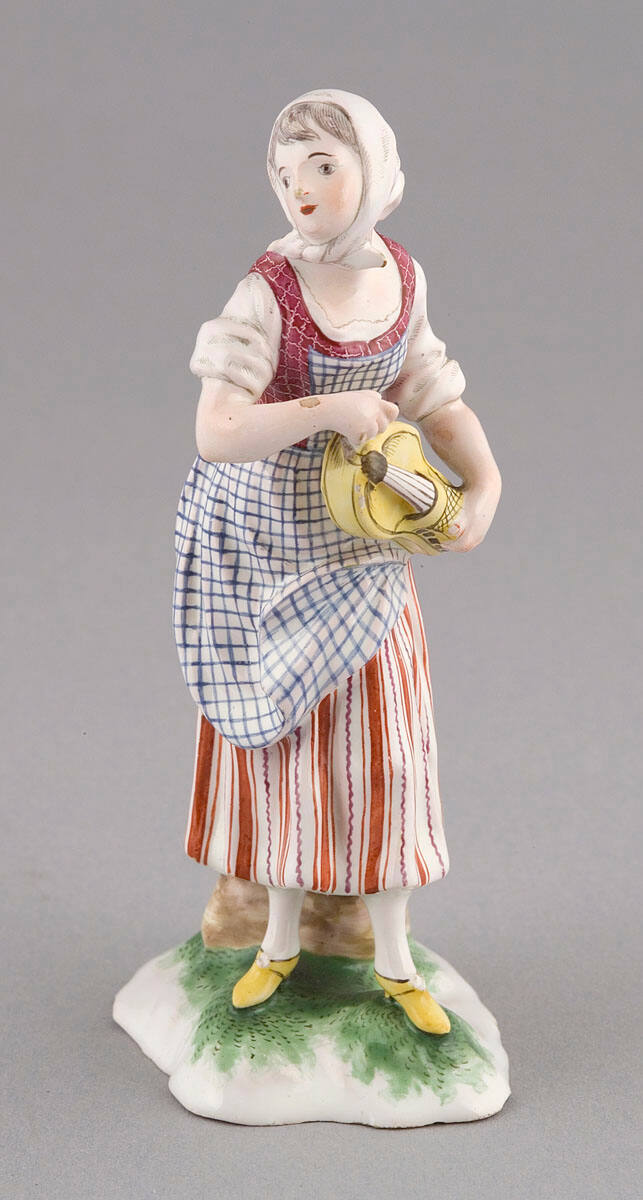 DescriptionStanding peasant woman in striped skirt and checked apron holding musical instrument.Exhibition History