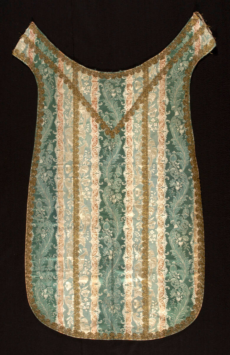 DescriptionLampas: woven with a striped sea-green and deep beige warp and a white binding warp. A white weft and patterning weft: satin and twill. The full selvedge width is not visible. The orphrey shape and the edges are mitred with silver-gilt bobbin lace dating from the 18th century.Exhibition HistoryThreads of Gold: Brocades and Embroideries for the Church, Spencer Museum of Art, University of Kansas, Lawrence, KS, July 2-September 1, 1985, no. 42.