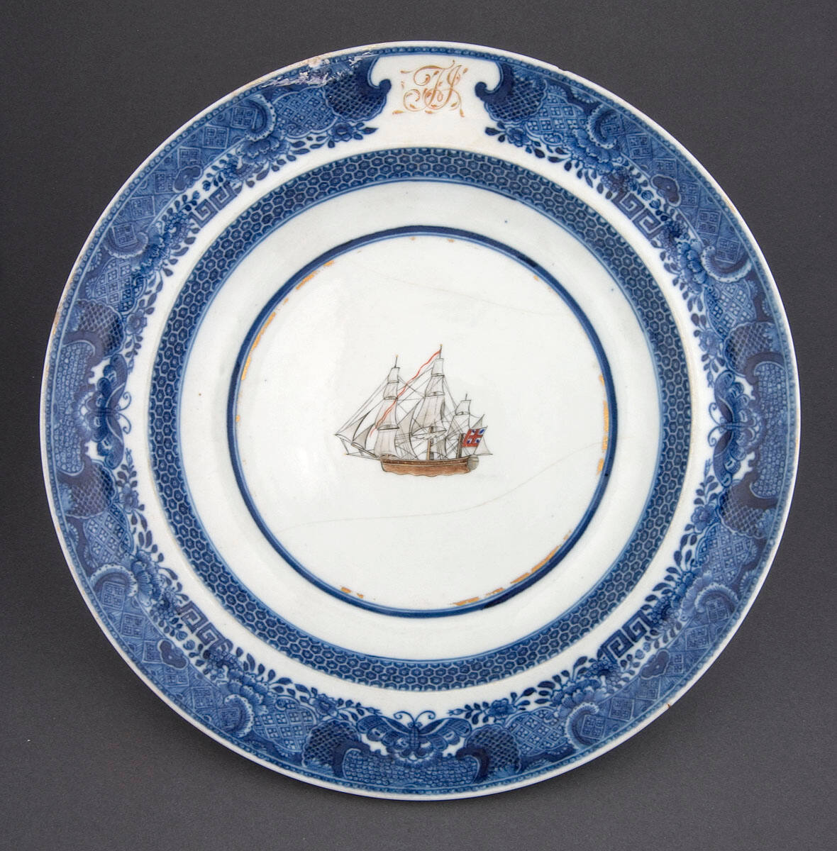 DescriptionBlue Fitzhugh border, with initials T.J. in center. Ship flying British flag.