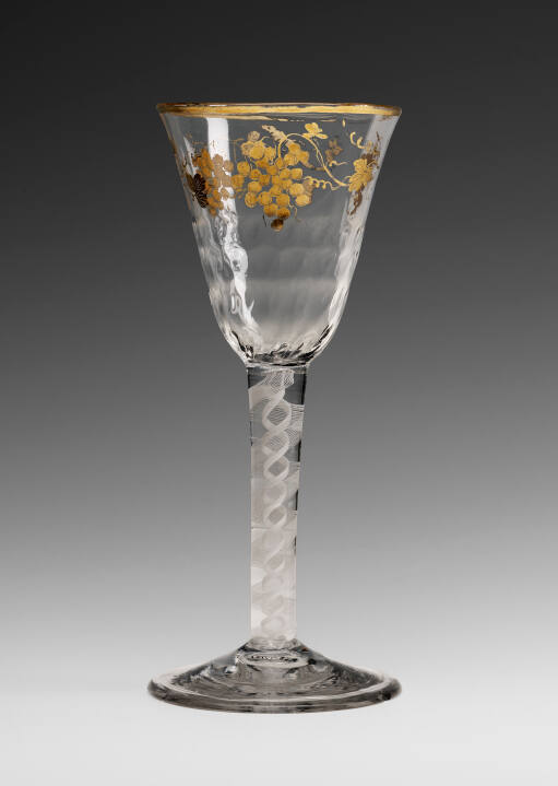 DescriptionPattern-molded ogee bowl with gilded floral and foliate decoration; opaque twist stem; colorless lead glass.