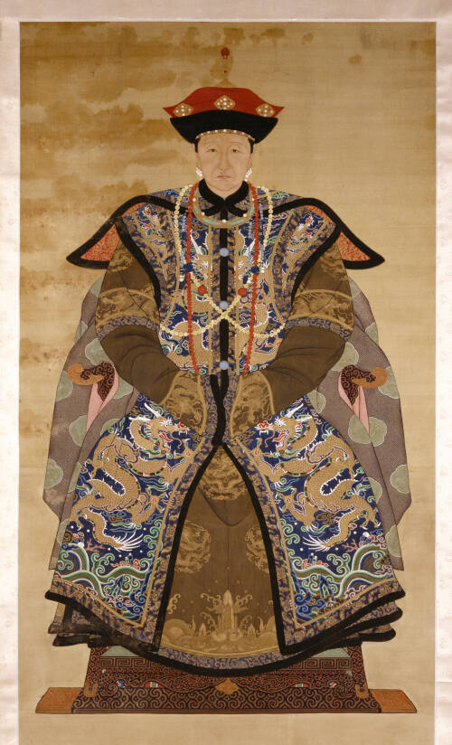 DescriptionLady seated wearing Imperial costume; blue sleeveless robe with wing collar, decorated with gold dragons; worn over brown robe with gold dragons.Gallery LabelThe ancestor’s costume identifies this as a portrait of a noblewoman of the Qing dynasty (1644–1911), when China was under Manchu rule. She is dressed in Manchu court style. Her dragon robe has narrow sleeves and horse-hoof shaped cuffs. The winged collar, court beads, fur-trimmed hat and earrings signify her noble status. At one time, this portrait showed a colorful carpet. Part of the pattern can be seen through the footstool, but the carpet was cut away at some time, when the bottom of the painting was replaced due to damage.
