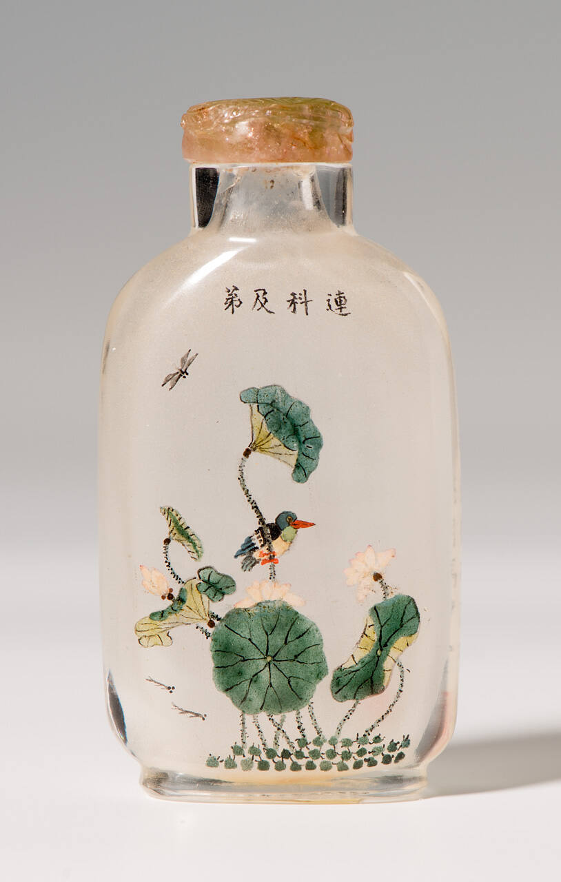 DescriptionRectagular-shaped Peking glass bottle inside painted with a lotus flower, a bird perching on a lotus stem with fish swimming in water and a dragonfly in flight on one side and on reverse with extensive inscription; carved pink and yellow tourmaline stopper.