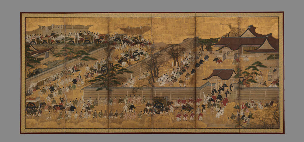 Most Japanese folding screens are designed in sets of two or four. Sometimes they are united by a single composition, moving from right to left. Here, the scenes are complementary rather than continuous. The right screen portrays the actual enthronement rites. The left depicts an unidentified procession.