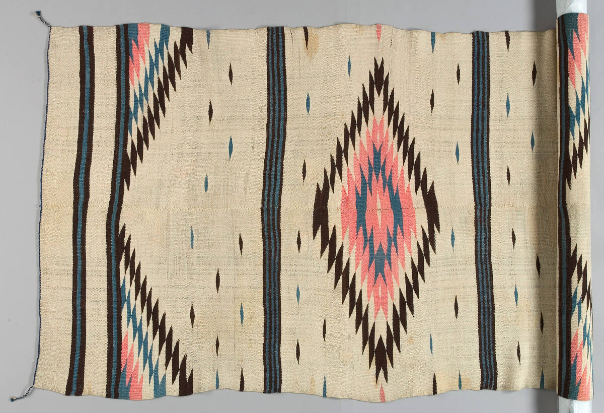 MediumWhite natural wool, blue indigo-dyed wool, and pink aniline-dyed wool; two pieces woven separately and sewn together treadle loom double warp manufacture (selvages replaced later by Fred Harvey Co.)